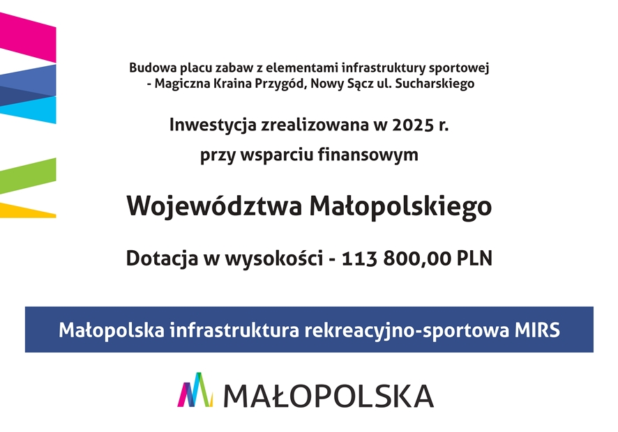Miasto Nowy Sącz pozyskało dofinansowanie na realizację zadania pn. „Budowa placu zabaw z elementami infrastruktury sportowej – Magiczna Kraina Przygód, Nowy Sącz ul. Sucharskiego”, współfinansowanego w ramach projektu „Małopolska Infrastruktura Rekreacyjno-Sportowa – MIRS” edycja 2025. Jest to kolejny krok w konsekwentnym rozwoju nowoczesnej i bezpiecznej infrastruktury rekreacyjnej na terenie miasta.