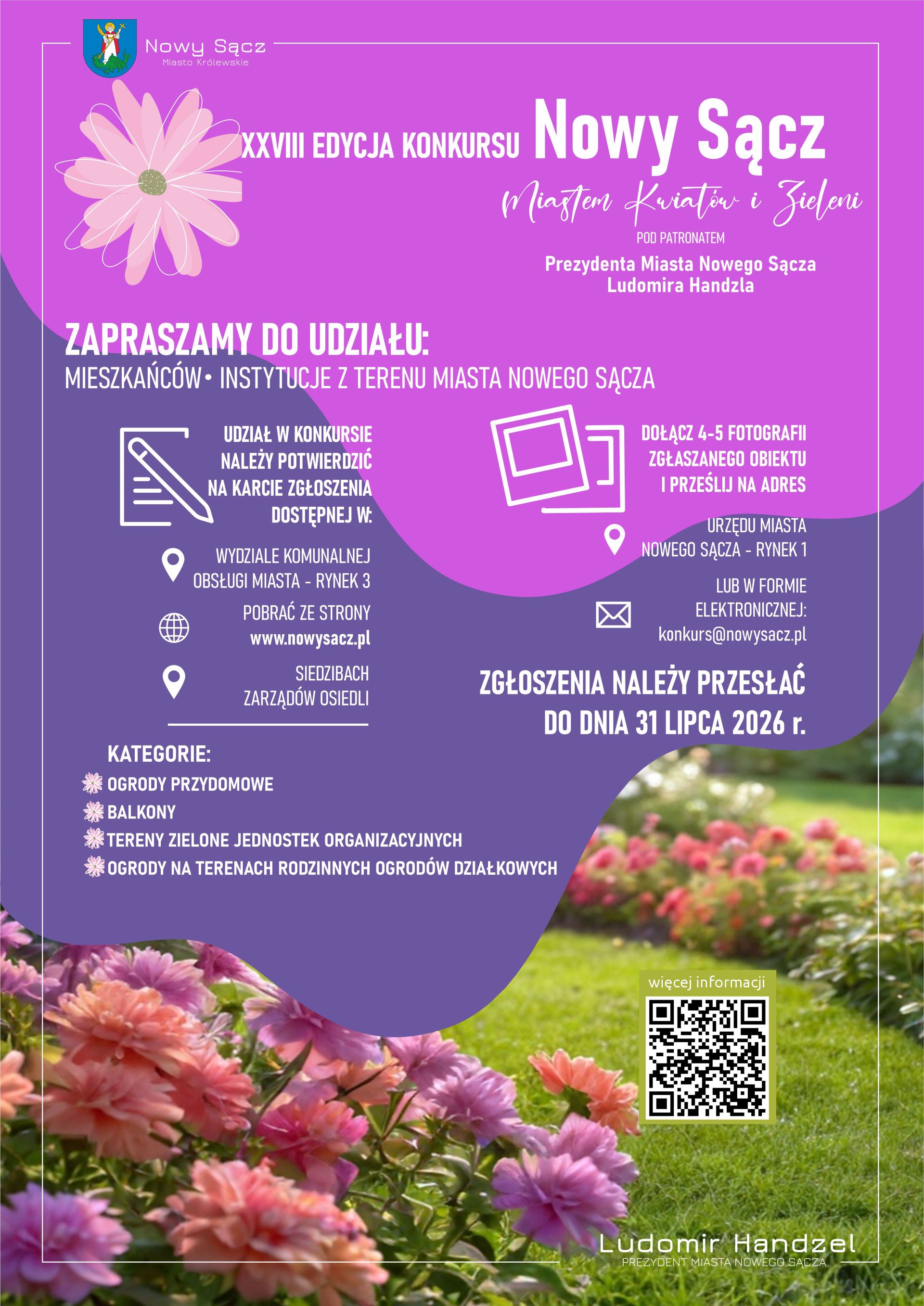 Prezydent Miasta Nowego Sącza, Ludomir Handzel, serdecznie zaprasza wszystkich mieszkańców do udziału w tegorocznej edycji konkursu "Nowy Sącz Miastem Kwiatów i Zieleni" - XXVIII edycja, który jest nie tylko wyrazem troski o estetykę naszego miasta, lecz również zaproszeniem do wspólnej działalności na rzecz zachowania piękna i czystości naszego otoczenia.