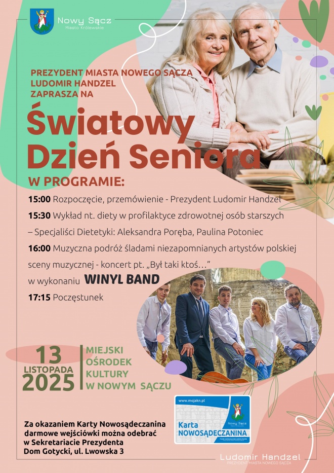 Prezydent Miasta Nowego Sącza - Ludomir Handzel, zaprasza nowosądeckich seniorów na Światowy Dzień Seniora, który odbędzie się 13 listopada 2025 roku w Miejskim Ośrodku Kultury w Nowym Sączu.
