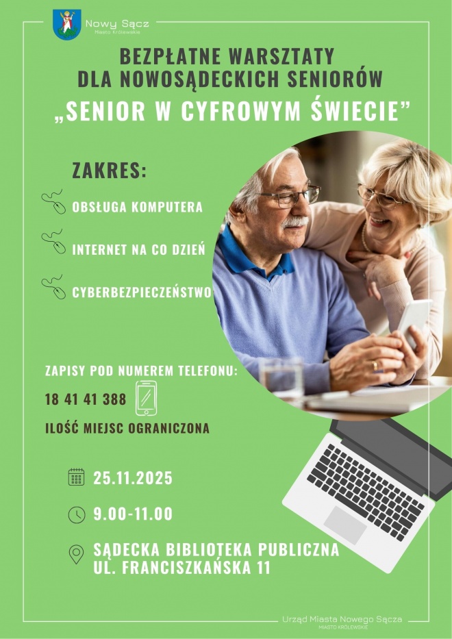 Bezpłatne warsztaty komputerowe dla nowosądeckich seniorów odbędą się 25 listopada (wtorek) od godziny 9.00 do 11.00 w Sądeckiej Bibliotece Publicznej przy ul. Franciszkańskiej 11.