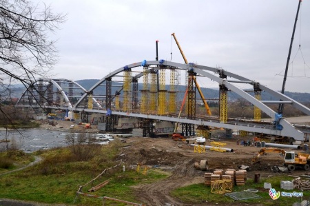 - Od strony dzielnicy Helena montaż łuków jest ukończony i trwają prace związane z demontażem podpór tymczasowych pod łukami. Po wykonaniu wstępnego sprężenia obiektu i przystąpieniu do montażu odciągów, czyli lin, zostanie rozpoczęty montaż deskowania płyty pomostu oraz zbrojenia i jej betonowania. Podobna sytuacja będzie występować od strony zamku, po zakończeniu montażu łuków - mówi dyrektor Miejskiego Zarządu Dróg w Nowym Sączu Grzegorz Mirek i dodaje: