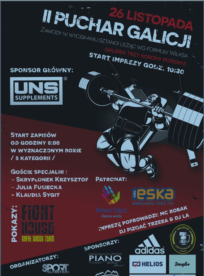 II Puchar Galicji - zawody w wyciskaniu sztangi leżąc według formuły Wilksa odbędą się 26 listopada w Galerii "Trzy Korony". Patronat nad imprezą sprawuje miasto Nowy Sącz.