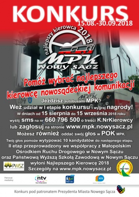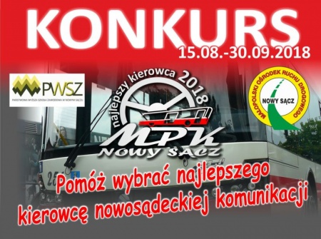 Miejskie Przedsiębiorstwo Komunikacyjne Sp. z o.o. w Nowym Sączu ma przyjemność poinformować, że od dnia 15 sierpnia 2018 r. rusza piąta edycja Konkursu na Najlepszego Kierowcę Komunikacji Miejskiej. Konkurs odbywa się pod patronatem prezydenta miasta Nowego Sącza Ryszarda Nowaka.
