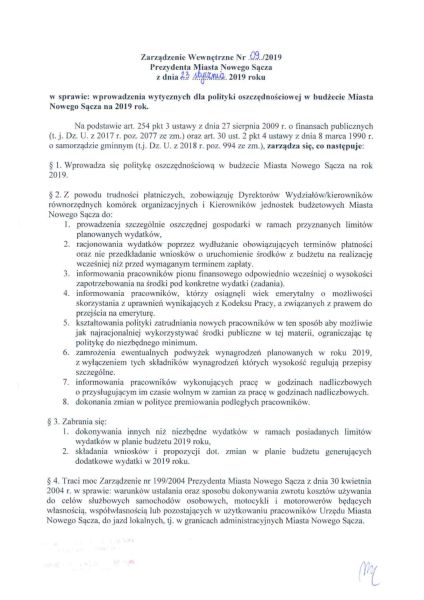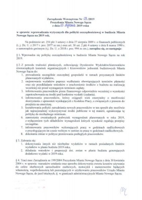 23 stycznia 2019 roku weszło w życie zarządzenie Prezydenta Miasta Nowego Sącza w sprawie wprowadzenia wytycznych dla polityki oszczędnościowej w budżecie Miasta Nowego Sącza.
