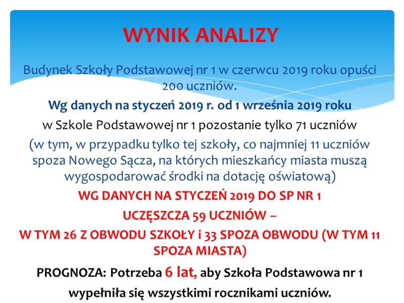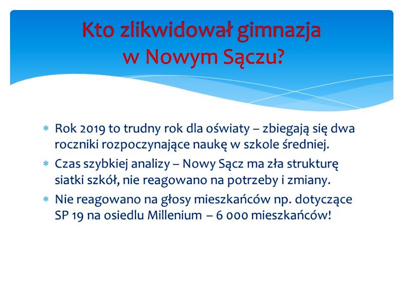 - Rok 2019 będzie bardzo trudny dla sądeckiej oświaty, ponieważ zbiegają się dwa roczniki, które kończą VIII klasę szkoły podstawowej i III klasę gimnazjum i rozpoczynają naukę w szkole średniej. Przed urzędnikami duże wyzwanie, aby zorganizować pracę w szkołach. Czas grudnia i stycznia był czasem szybkiej analizy, która doprowadziła do przedstawienia sytuacji sieci szkół w Nowym Sączu, a ta nie jest właściwa. Wielokrotnie nie reagowano na potrzeby, nie dokonywano wyprzedzająco zmian lub nie były one trafione. Nie reagowano na uwagi zgłaszane przez nauczycieli i rodziców. Takim przykładem jest likwidacja Szkoły Podstawowej nr 19 na osiedlu Millenium, gdzie mieszka, w niedalekiej odległości, blisko 6 tys. osób - podkreślił Prezydent Miasta Nowego Sącza Ludomir Handzel.