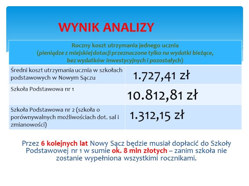 Omawiając raport przedstawił m.in. kwoty, jakie miasto dokłada do edukacji każdego dziecka. - Średnio w Nowym Sączu do edukacji jednego dziecka dokładamy kwotę 1727 zł, w SP nr 2 - 1312 zł. Natomiast w SP nr 1 jest to kwota 10 tys. 812 zł. (…) Jeżeli mamy informację, że w ciągu najbliższych 6 lat będziemy musieli do tej szkoły dopłacić 8 mln zł, to pojawia się pytanie, czy nie lepiej przeznaczyć te środki na inne cele związane z oświatą.