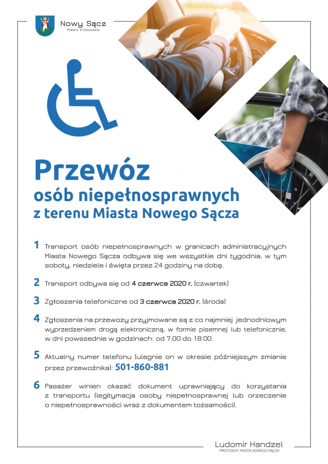 1.Transport osób niepełnosprawnych w granicach administracyjnych Miasta Nowego Sącza odbywa się we wszystkie dni tygodnia, w tym soboty, niedziele i święta przez 24 godziny na dobę.