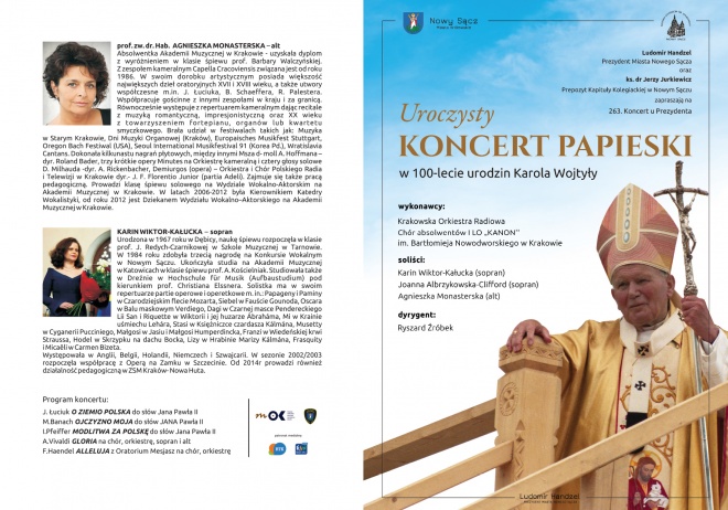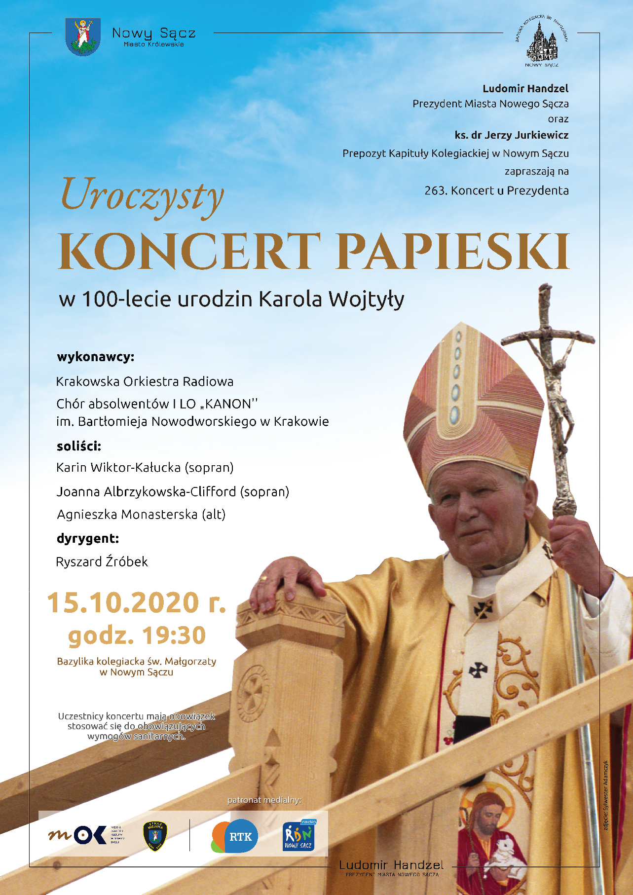 Prezydent Ludomir Handzel wraz z ks. Dr. Jerzym Jurkiewiczem, prepozytem kapituły kolegiackiej w Nowym Sączu, zapraszają na 263. Koncert u Prezydenta. Uroczysty Koncert Papieski odbędzie się w 100-lecie urodzin Karola Wojtyły 15 października o godzinie 19:30 w Bazylice Kolegiackiej św. Małgorzaty w Nowym Sączu.