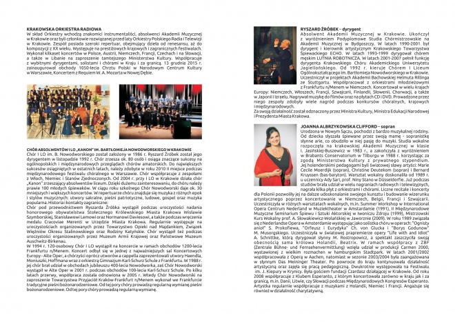 Podczas koncertu prezentowała będzie się Krakowska Orkiestra Radiowa, Chór absolwentów I LO‘’ KANON’’ im. Bartłomieja Nowodworskiego w Krakowie. Jako soliści wystąpią Karin Wiktor – Kałucka (sopran), Joanna Albrzykowska – Clifford (sopran), Agnieszka Monasterska (alt). Dyrygentem będzie Ryszard Żłóbek.