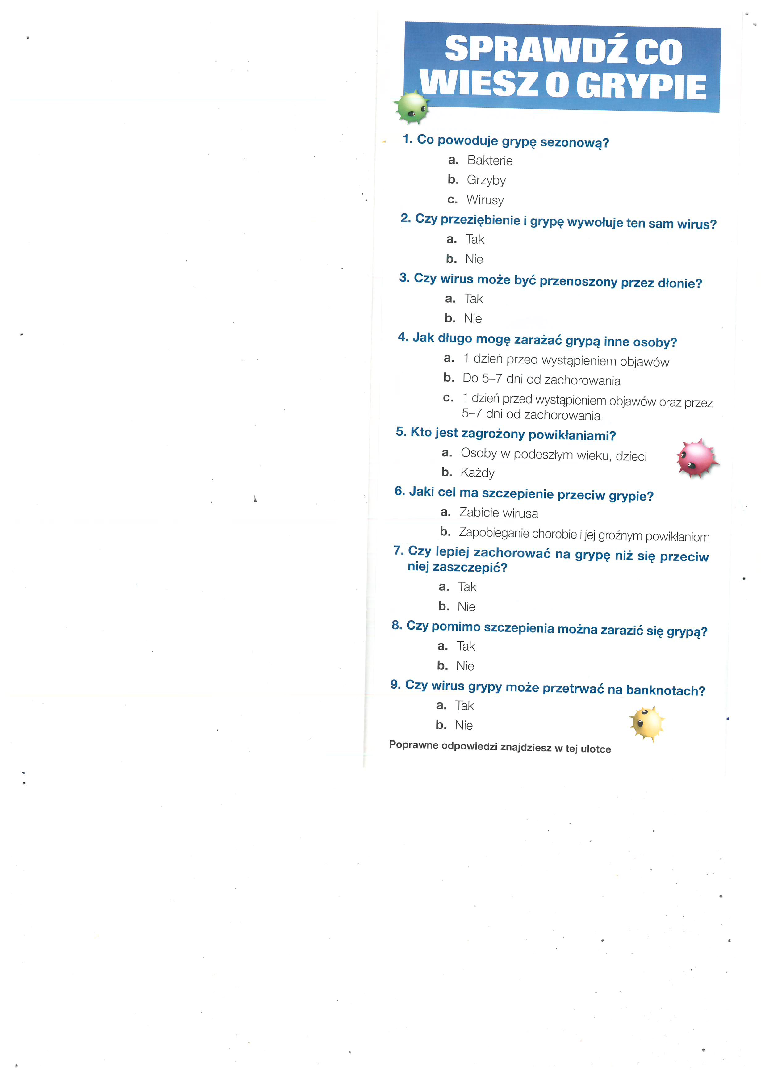 Prosimy o stosowanie zasad bezpieczeństwa w okresie pandemii koronawirusa SARS-COV-2 obowiązujących na terenie przychodni realizującej program szczepień przeciw grypie. Wymagane będzie, aby każdy uczestnik programu przyszedł na teren przychodni w maseczce ochronnej, dezynfekował ręce i zachowywał odpowiedni dystans społeczny. Pacjenci będą umawiani indywidualnie, na określoną godzinę, tak aby w poczekalni przebywało w jednym czasie jak najmniej osób.