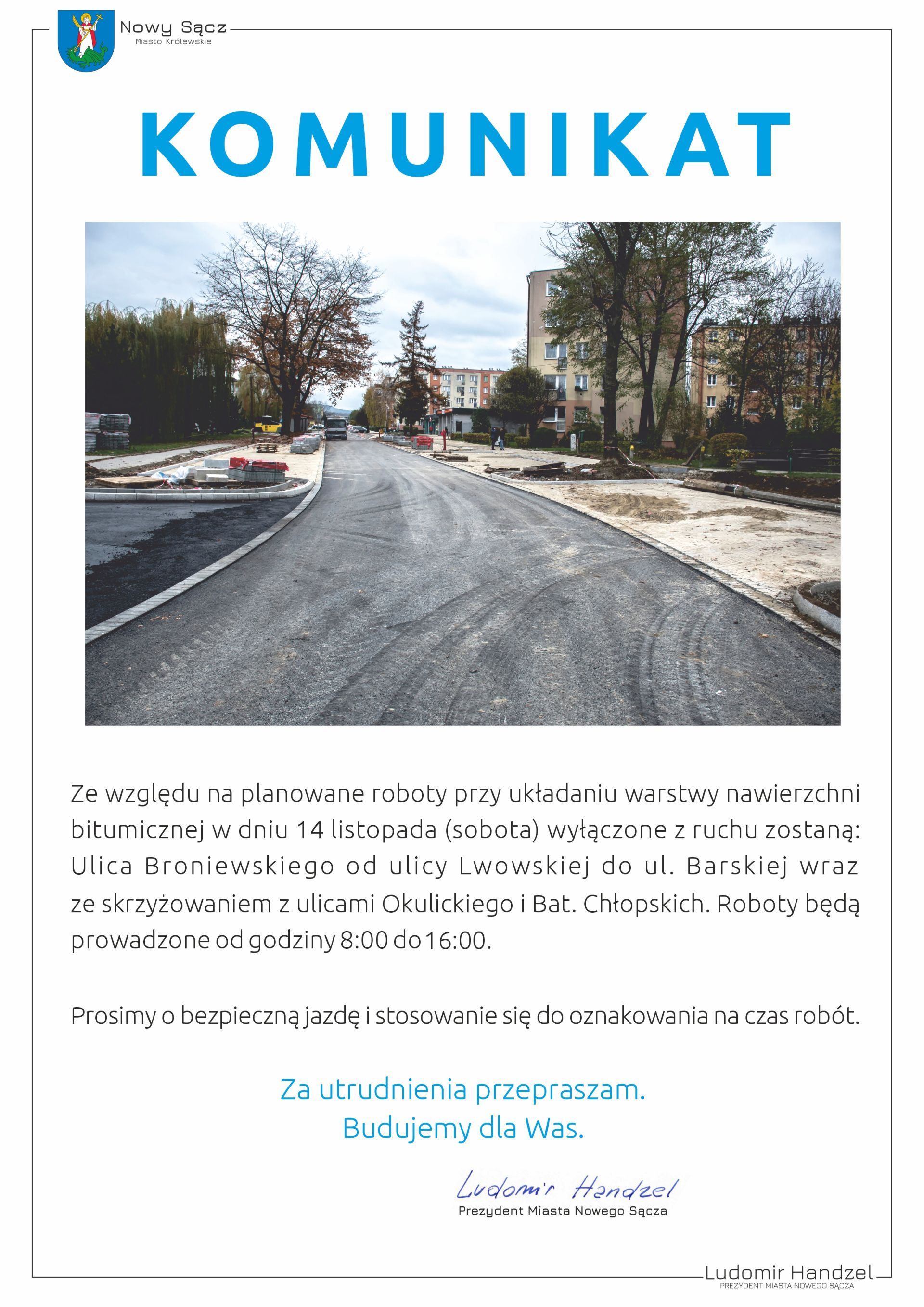 Ze względu na planowane roboty przy układaniu warstwy nawierzchni bitumicznej w dniu 14 listopada (sobota) wyłączone z ruchu zostaną: Ulica Broniewskiego od ulicy Lwowskiej do ul. Barskiej wraz ze skrzyżowaniem z ulicami Okulickiego i Bat. Chłopskich. Roboty będą prowadzone od godziny 8.00 do 16:00.