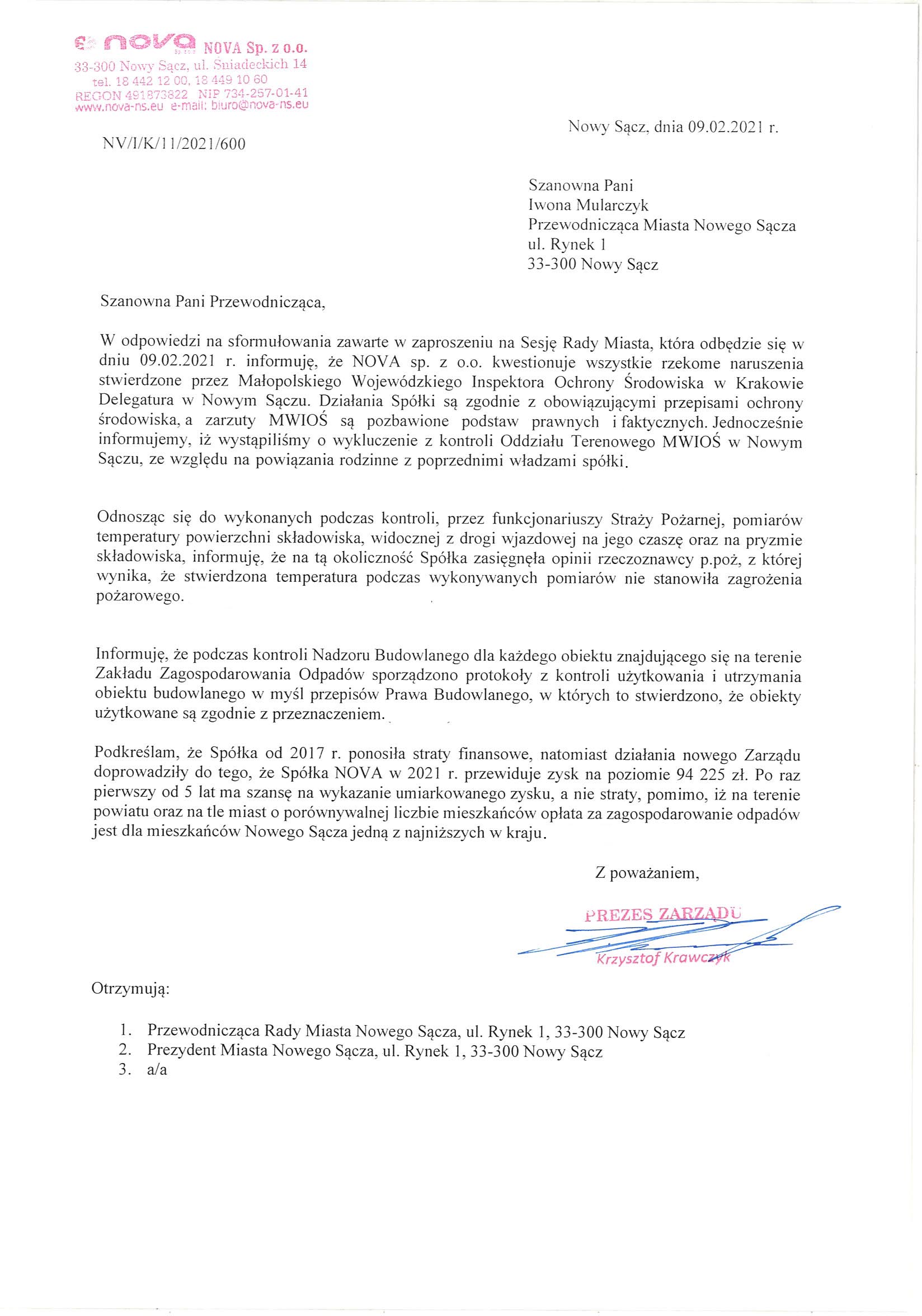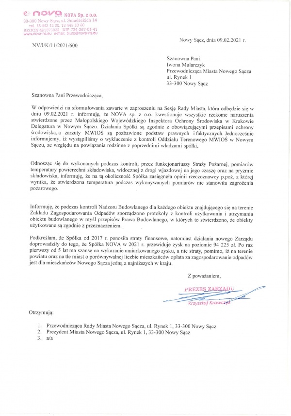 Prezydent podkreślił również, że działania nowego Zarządu doprowadziły do tego, że Spółka NOVA w 2021 r. prognozuje zysk na poziomie prawie 95 tysięcy złotych.