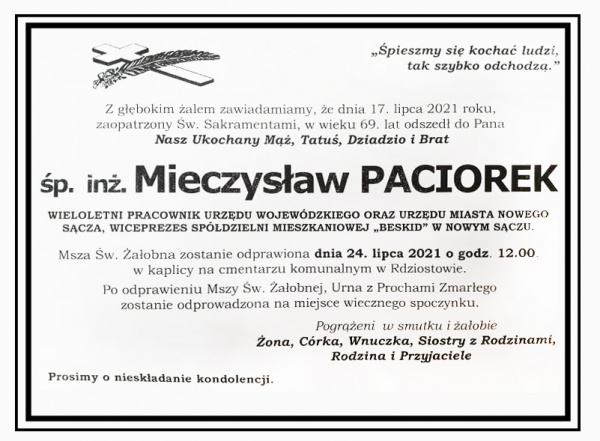 W wieku 69 lat zmarł inż. Mieczysław Paciorek, pracownik Urzędu Miasta Nowego Sącza, wiceprezes spółdzielni "Beskid" w Nowym Sączu. Msza św. żałobna zostanie odprawiona dnia 24 lipca o godzinie 12:00 na Cmentarzu Komunalnym w Rdziostowie.