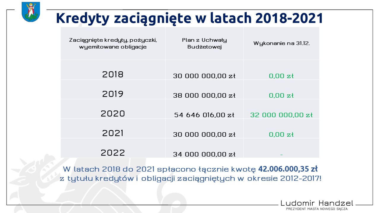 Prezydent Ludomir Handzel wspomniał również, że w latach 2018 do 2021 spłacono łącznie kwotę 42.006.000,35 zł z tytułu kredytów i obligacji zaciągniętych w okresie 2012 – 2017!