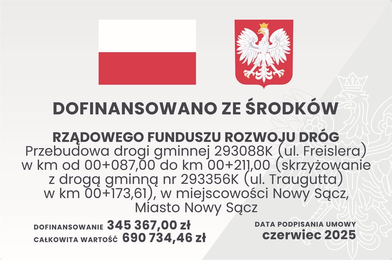 Całkowity koszt inwestycji to 690 734,46 zł, z czego dofinansowanie ze środków Rządowego Funduszu Rozwoju Dróg na realizację zadania pn. „Przebudowa drogi gminnej 293088K (ul. Freislera) w km od 00+087,00 do km 00+211,00 (skrzyżowanie z drogą gminną nr 293356K (ul. Traugutta) w km 00+173,61), w miejscowości Nowy Sącz, Miasto Nowy Sącz”, wyniosło 345 367,00 zł.