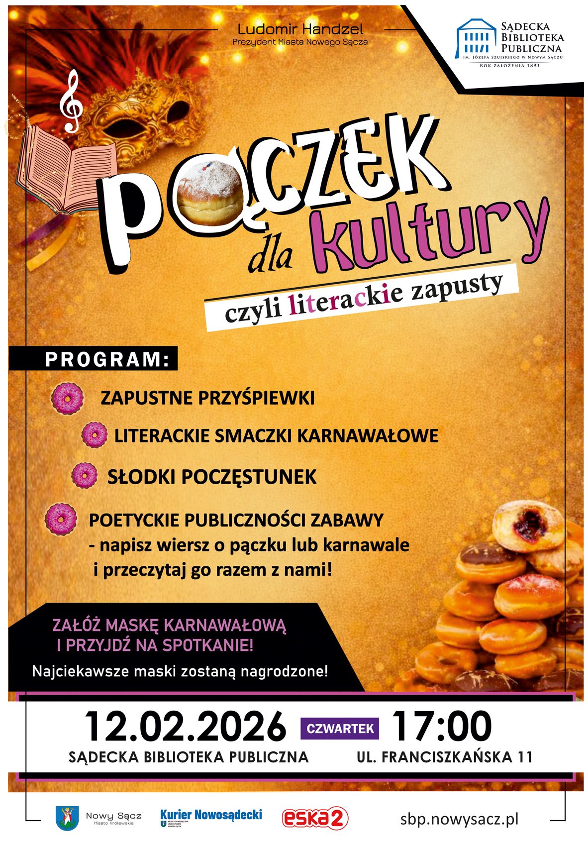 Sądecka Biblioteka Publiczna zaprasza na kolejną odsłonę spotkania literacko-karnawałowego pn. "Pączek dla kultury, czyli literackie zapusty".