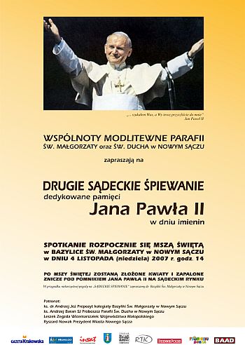 W najbliższą niedzielę 4 listopada o godz. 15.00 odbędzie się „Drugie sądeckie śpiewanie dedykowane papieżowi Janowi Pawłowi II”. Spotkanie poprzedzi msza św. odprawiona w Bazylice Kolegiackiej św. Małgorzaty o godz. 14.00. Następnie pod pomnikiem Jana Pawła II na płycie Rynku sądeczanie zaśpiewają dla papieża jego ulubione pieśni i piosenki. Organizatorem spotkania są: wspólnoty modlitewne parafii św. Małgorzaty i Ducha św. Natomiast patronat nad „Drugim sądeckim śpiewaniem dla Jana Pawła II” sprawują: Ryszard Nowak - Prezydent Nowego Sącza, Leszek Zegzda - Wicemarszałek Województwa Małopolskiego oraz ks. dr Andrzej Jeż - proboszcz Bazyliki św. Małgorzaty i ks. Andrzej Baran - proboszcz parafii Św. Ducha.