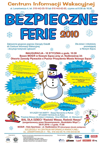 Zbliża się okres ferii zimowych. Z tej okazji dla dzieci i młodzieży pozostającej w tym okresie w Nowym Sączu,Urząd Miasta, Policja, placówki oświatowo-wychowawcze oraz zarządy sądeckich osiedli, przygotowali szereg atrakcji w ramach kolejnej już edycji „Bezpiecznych Ferii”. Inauguracja akcji odbędzie się 18 stycznia 2010 r. w obiekcie krytej pływalni MOSiR, gdzie o godz. 10:00 odbędą się zawody pływackie o Puchar Prezydenta Miasta Nowego Sącza.