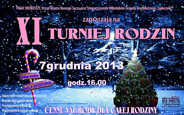Pałac Młodzieży w Nowym Sączu oraz Stowarzyszenie Miłośników Zespołu Regionalnego "Sądeczoki" zapraszają na XI edycję "TURNIEJU RODZIN", który odbędzie się 7 grudnia 2013 roku, o godz. 16.00, w Hali Sportowej przy ul. Nadbrzeżnej. Organizatorzy - jak co roku - przygotowali wiele konkursów, występów artystycznych, a także atrakcyjne nagrody.