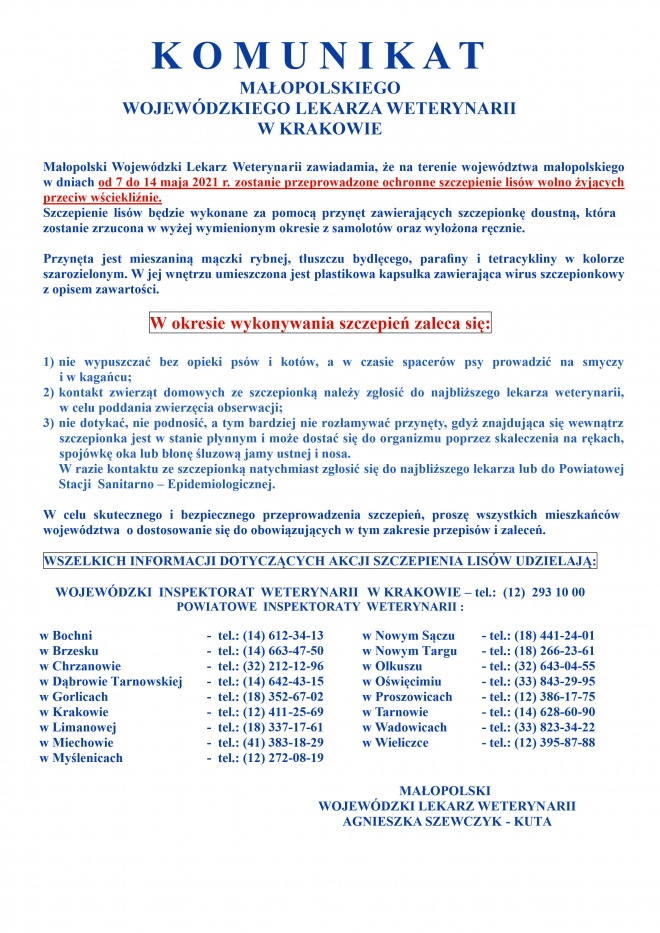 Powiatowy Lekarz Weterynarii w Nowym Sączu informuje, że w dniach od 7 maja do 14 maja 2021r. odbędzie się wiosenna akcja szczepienia lisów przeciwko wściekliźnie na terenie województwa Małopolskiego. Zostanie ona wykonana poprzez rozrzucenie szczepionki z samolotów i jej ręczne wyłożenie.