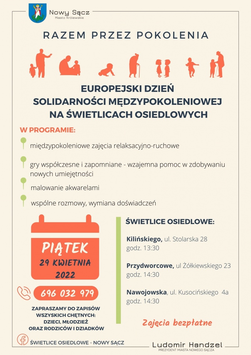 Z okazji Europejskiego Dnia Solidarności Międzypokoleniowej na naszych świetlicach zaplanowane są zajęcia dla chętnych seniorów, dzieci i młodzieży oraz ich rodziców, które będą polegały na wymianie wiedzy, doświadczeń oraz sposobów patrzenia na świat pomiędzy osobami starszymi a młodszym pokoleniem.