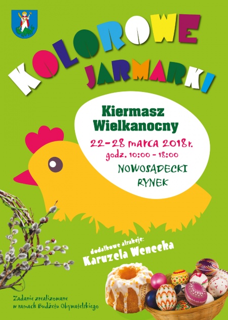 Dzięki aktywności mieszkańców naszego miasta w edycji Budżetu Obywatelskiego Nowego Sącza na 2018 rok już wkrótce odbędzie się Kiermasz Wielkanocny "Kolorowe Jarmarki"! To pierwszy z dwóch jarmarków, o które wnioskowali pomysłodawcy zadania "Kolorowe Jarmarki" - Nowosądecki smak i regionalny klimat świąt - organizacja targów świątecznych na sądeckim rynku".
