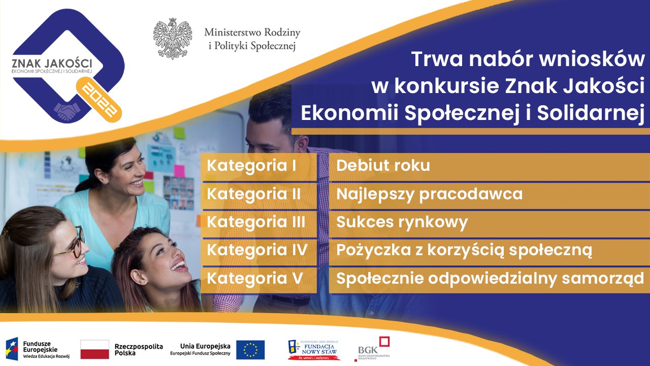 Jeszcze do 4 maja 2022 r. trwa nabór do kolejnej edycji konkursu o przyznanie certyfikatu "Znak Jakości Ekonomii Społecznej i Solidarnej 2022" .