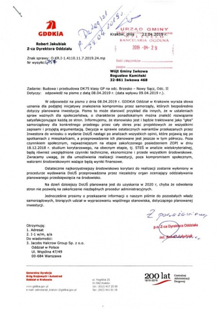 Stanowisko wypracowane przez samorządy i podpisane 4 kwietnia na spotkaniu w Iwkowej, zostało przez wójta gminy wysłane do Ministra Infrastruktury, firmy projektowej oraz Generalnej Dyrekcji Dróg Krajowych i Autostrad, do której należy ostateczna decyzja o przebiegu drogi.