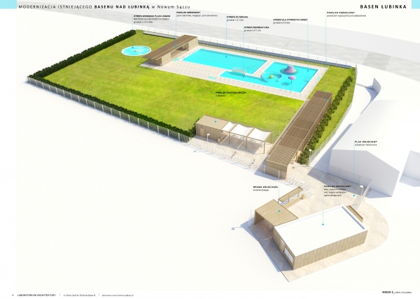 Wokół niecki basenowej zlokalizowana będzie plaża basenowa, a od strony południowej planowana jest strefa plażowa z nawierzchnią trawiastą.