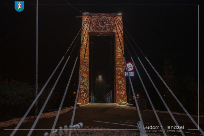 Kładka nad Kamienicą to jedno z kilku miejsc w Nowym Sączu, które podczas zakończonego ostatnio Pierwszego Ulicznego Pleneru Artystycznego „Siew” zyskało zupełnie nowy charakter. To co możemy podziwiać w tym miejscu jest dziełem Pawła Swanskiego, twórcy inspirującego się sztuką folklorystyczną całego świata, co widać pięknie na naszej kładce - kiedyś szarej i niczym się nie wyróżniającej, a teraz niezwykłej i fantastycznie kolorowej. Wymalowanie kładki było nie lada wyzwaniem, zachowanie spójności artystycznej na tego typu obiekcie – kilkuczęściowym, wielopowierzchniowym, wymagało naprawdę nieprzeciętnego talentu. Autor tej pracy, Paweł Swansky, znany jest nie tylko w całek Polsce, jego murale można zobaczyć na ulicach miast i w domach prywatnych w Berlinie, Bristolu, Los Angeles, Toronto, Taiwanie czy w Tokio.