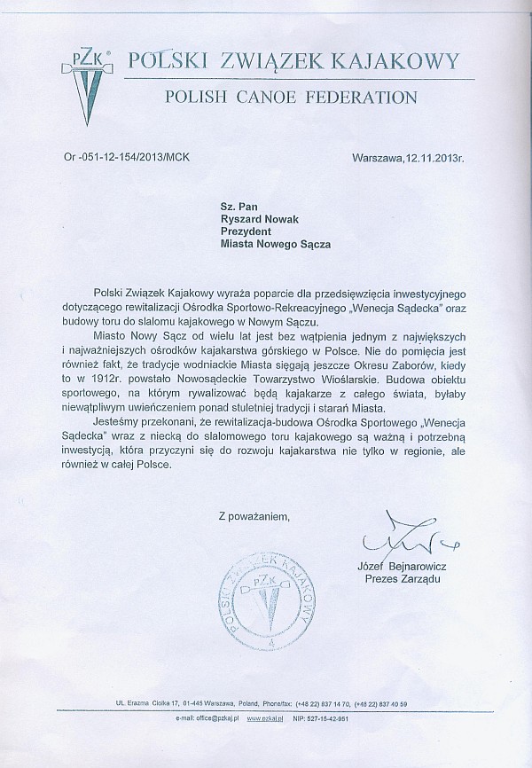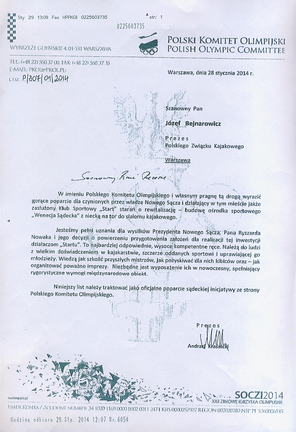 Pisma zapewniające poparcie dla czynionych przez władze Nowego Sącza i Klub Sportowy "Start" starań o rewitalizację - budowę ośrodka sportowego „Sądecka Wenecja ”, prezydent otrzymał od Andrzeja Kraśnickiego, Prezesa Polskiego Komitetu Olimpijskiego oraz Józefa Bejnarowicza, Prezesa Polskiego Związku Kajakowego.