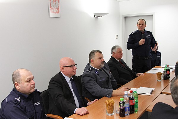 Komendant Miejski Policji w Nowym Sączu insp. Marek Rudnik przywitał gości, a następnie wspólnie ze swoimi zastępcami – mł. insp. Rafałem Leśniakiem i podinsp. Jarosławem Tokarczykiem omówił prezentację multimedialną określającą poziom bezpieczeństwa na terenie miasta Nowego Sącza oraz powiatu nowosądeckiego w roku 2013 roku.