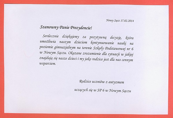 Rodzice uczniów z autyzmem podziękowali prezydentowi Ryszardowi Nowakowi za pozytywną decyzję, która umożliwia dzieciom kontynuowanie nauki na poziomie gimnazjum, na terenie Szkoły Podstawowej nr 6 w Nowym Sączu. „Okazanie zrozumienia dla sytuacji w jakiej znajdują się nasze dzieci i my jako rodzice, jest dla nas cennym wsparciem” - napisali w specjalnym liście rodzice dzieci z autyzmem.