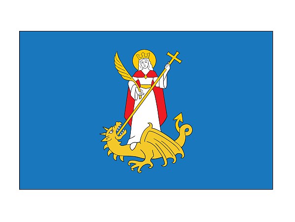 Przedstawia na błękitnym płacie godło herbu miasta, św. Małgorzatę stojącą na smoku. Stosunek długości do szerokości płata wynosi 5 : 8. Chorągiew została opracowana według klasycznych zasad chorągwi staropolskich. Przedstawia na płacie w barwie pola herbu godło miasta.
