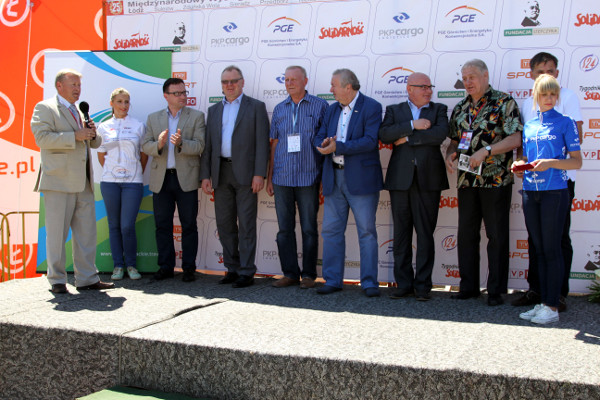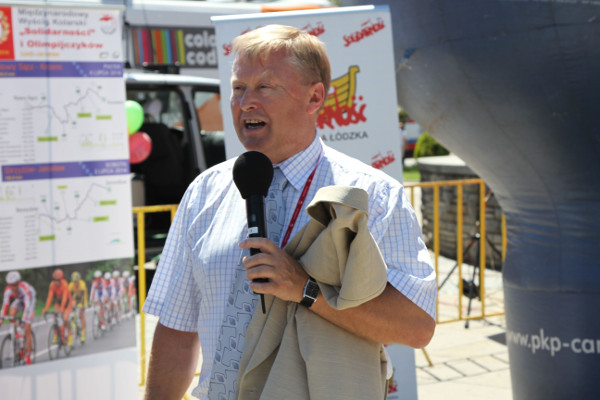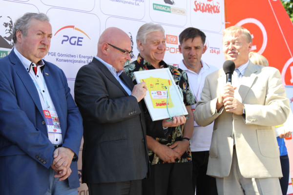 Waldemar Krenc, przewodniczący komitetu organizacyjnego, wręczył prezydentowi Ryszardowi Nowakowi symboliczną żółtą koszulkę lidera, jubileuszowego 25. Międzynarodowego Wyścigu Kolarskiego Solidarności i Olimpijczyków.