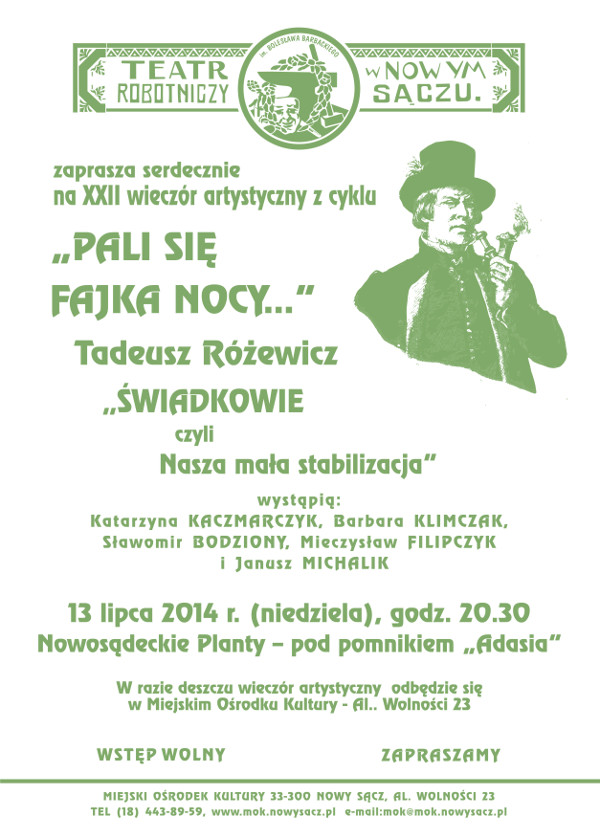 13 lipca o godz. 20:30 na nowosądeckich Plantach, pod pomnikiem Adama Mickiewicza, aktorzy Teatru Robotniczego im. B. Barbackiego zaprezentują dramat Tadeusza Różewicza pt. "Świadkowie, czyli nasza mała stabilizacja".