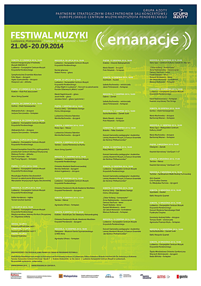 Festiwal EMANACJE to wydarzenie muzyczne o szczególnym bogactwie oferty koncertowej. W ramach drugiej edycji wydarzenia, w okresie od czerwca do września, na terenie całego województwa małopolskiego odbywają się liczne koncerty. Sercem tego przedsięwzięcia jest Europejskie Centrum Muzyki Krzysztofa Pendereckiego w Lusławicach.