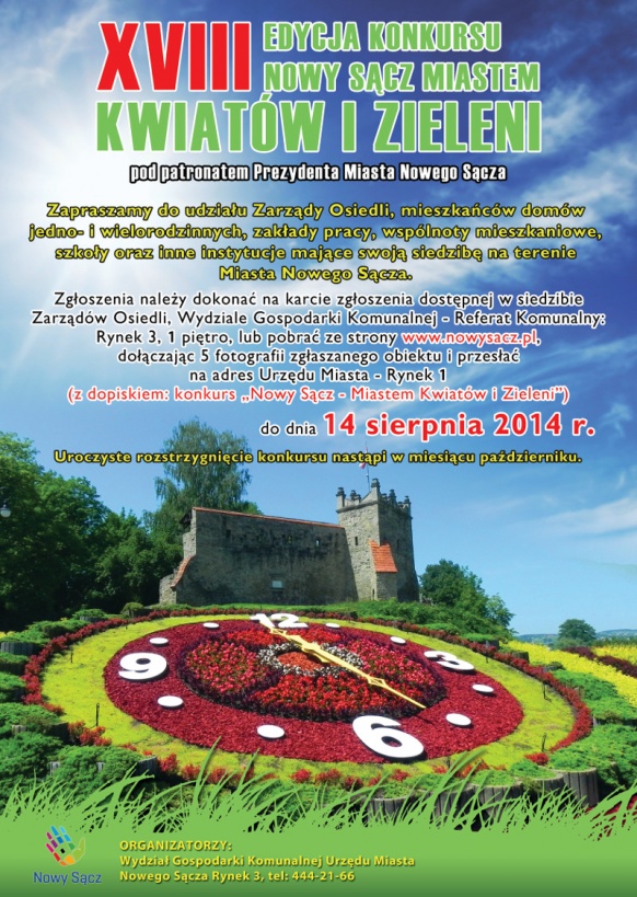 Jeszcze do 14 sierpnia można składać zgłoszenia do XVIII Konkursu NOWY SĄCZ MIASTEM KWIATÓW I ZIELENI. Do konkursu zapraszane są zarządy osiedli, mieszkańcy domów jedno i wielorodzinnych, zakłady pracy, wspólnoty mieszkaniowe, szkoły oraz inne instytucje z terenu miasta Nowego Sącza. Wydarzenie odbywa się pod honorowym patronatem prezydenta Ryszarda Nowaka.