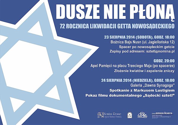 24 sierpnia (niedziela) o g. 18.00 w Galerii „Dawna Synagoga” wysłuchamy wspomnień Markusa Lustiga, który jako naoczny świadek tego tragicznego okresu w dziejach miasta, opowie o losach sądeckiego getta. Odbędzie się także pokaz filmu dokumentalnego „Sądecki sztetl” wyreżyserowanego przez Barbarę Szewczyk.