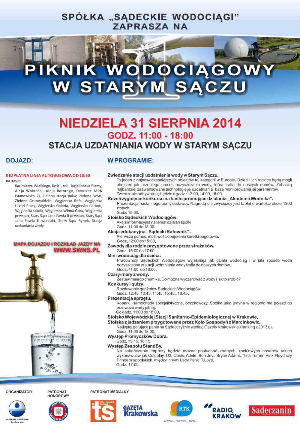 Od godziny 10:30 na trasie ul. Kazimierza Wielkiego Nowy Sącz - Stacja Uzdatniania Wody Stary Sącz, będzie kursować bezpłatna linia autobusowa dowożąca uczestników pikniku. Szczegóły na plakacie.