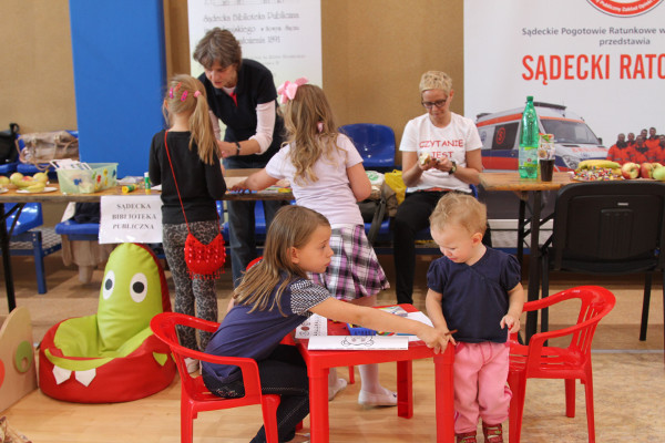 - Sądecka Biblioteka Publiczna - punkt informacyjny, stanowisko z książeczkami dla najmłodszych