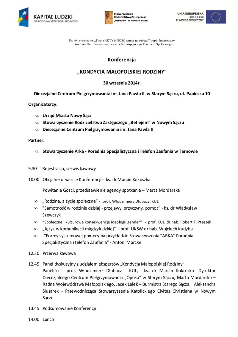 W ramach konferencji odbędą się wykłady tematyczne oraz panel dyskusyjny z udziałem ekspertów "Kondycja Małopolskiej Rodziny". Wśród panelistów będą obecni: prof. Włodzimierz Dłubacz - KUL, ks. dr Marcin Kokoszka - dyrektor Diecezjalnego Centrum Pielgrzymowania "Opoka" w Starym Sączu, Marta Mordarska, radna wojewódzka, Jacek Lelek - burmistrz Starego Sącza, Aleksandra Ślusarek - przewodnicząca Stowarzyszenia Katolickiego Civitas Christiana w Nowym Sączu.