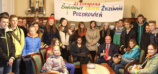 Młodzież z Gimnazjum nr 2z okazji Światowego Dnia Życzliwości i Pozdrowień odwiedziła prezydenta Nowego Sącza Ryszarda Nowaka. Młodzi ludzie złożyli prezydentowi życzenia i zachęcali poprzez własny przykład do świadczenia życzliwości i uśmiechania się do drugich.