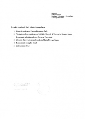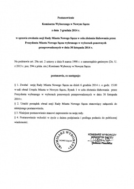 Postanowienie Komisarza Wyborczego w Nowym Sączu z dnia 3 grudnia 2014 r., w sprawie: zwołania Sesji Rady Miasta Nowego Sącza w celu złożenia ślubowania przez Prezydenta Miasta Nowego Sącza wybranego w wyborach ponownych przeprowadzonych w dniu 30 listopada 2014 r.
