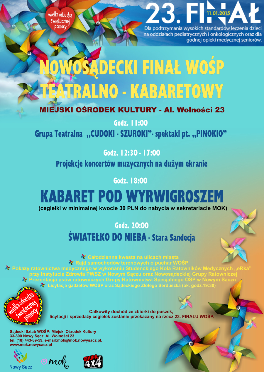 W niedzielę 11 stycznie odbędzie się XXIII Finał Wielkiej Orkiestry Świątecznej Pomocy. Nowosądecki sztab, działający w Miejskim Ośrodku Kultury w Nowym Sączu, nadał wydarzeniu nieco inny charakter niż w latach poprzednich, a finał odbędzie się w formie teatralno-kabaretowej z domieszką prezentacji na dużym ekranie kilku koncertów muzycznych.