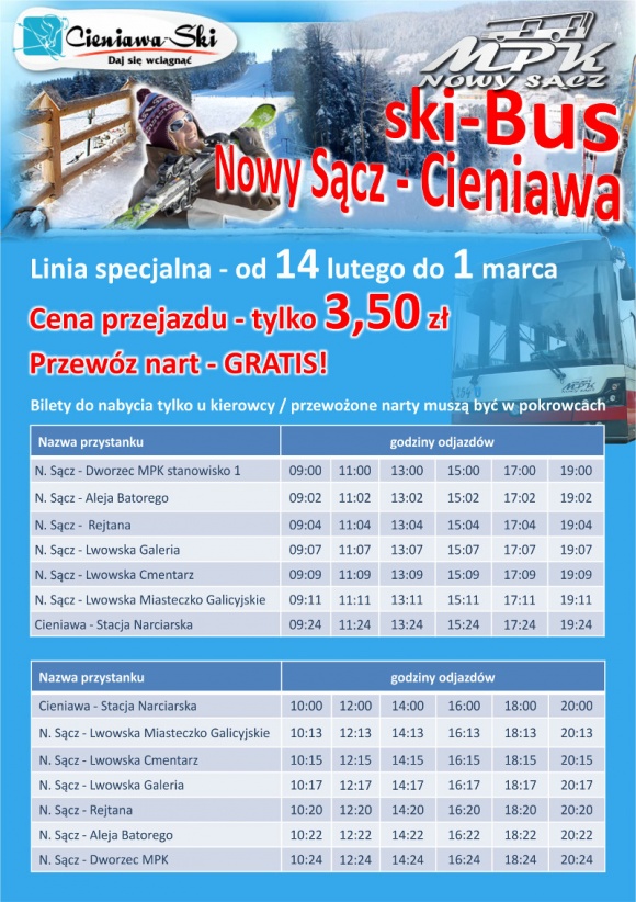 Miejskie Przedsiębiorstwo Komunikacyjne Sp. z o.o. w Nowym Sączu informuje, że w okresie ferii zimowych uruchomiona zostaje specjalna linia Nowy Sącz – Cieniawa, która dowiezie pasażerów pod samą stacje narciarską w Cieniawie.