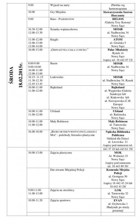 Trzeciego dnia ferii (18 lutego) Komenda Miejska Policji zaprasza na dni otwarte, w Miejskim Ośrodku Kultury odbędą się zajęcia plastyczne dla dzieci, a Pałac Młodzieży proponuje "Gimnastykę ciała i umysłu". W oddziale dla dzieci Sądeckiej Biblioteki Publicznej przygotowano podchody literacko-plastyczne pn. "Biuro detektywistyczne Lassego i Mai", a na wielbicieli sportów walki w Klubie Sportowym "Evan" odbędą się zajęcia z kick-boxingu.
