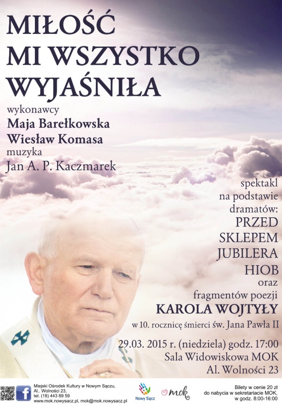 W niedzielę 29 marca o godz. 17:00 w Sali Widowiskowej Miejskiego Ośrodka Kultury w Nowym Sączu zostanie wystawiony spektakl "Miłość mi wszystko wyjaśniła", który powstał na podstawie tekstów Karola Wojtyły.