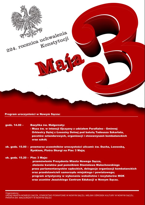 W uroczystościach udział wezmą władze miasta, powiatu, parlamentarzyści,samorządowcy, orkiestra, poczty sztandarowe organizacji i stowarzyszeń kombatanckich oraz szkół. Po mszy św. uczestnicy przemaszerują ulicami: św. Ducha, Lwowską, Rynkiem, Piotra Skargi na Plac 3 Maja, gdzie przemówienie wygłosi Prezydent Miasta Ryszard Nowak oraz złożone zostaną kwiaty pod pomnikiem Stanisława Małachowskiego. Uroczystości zakończy śpiewanie pieśni patriotycznych, które wspólnie z uczestnikami zaśpiewają wokaliści MOK oraz uczniowie Jezuickiego Centrum Edukacji w Nowym Sączu.