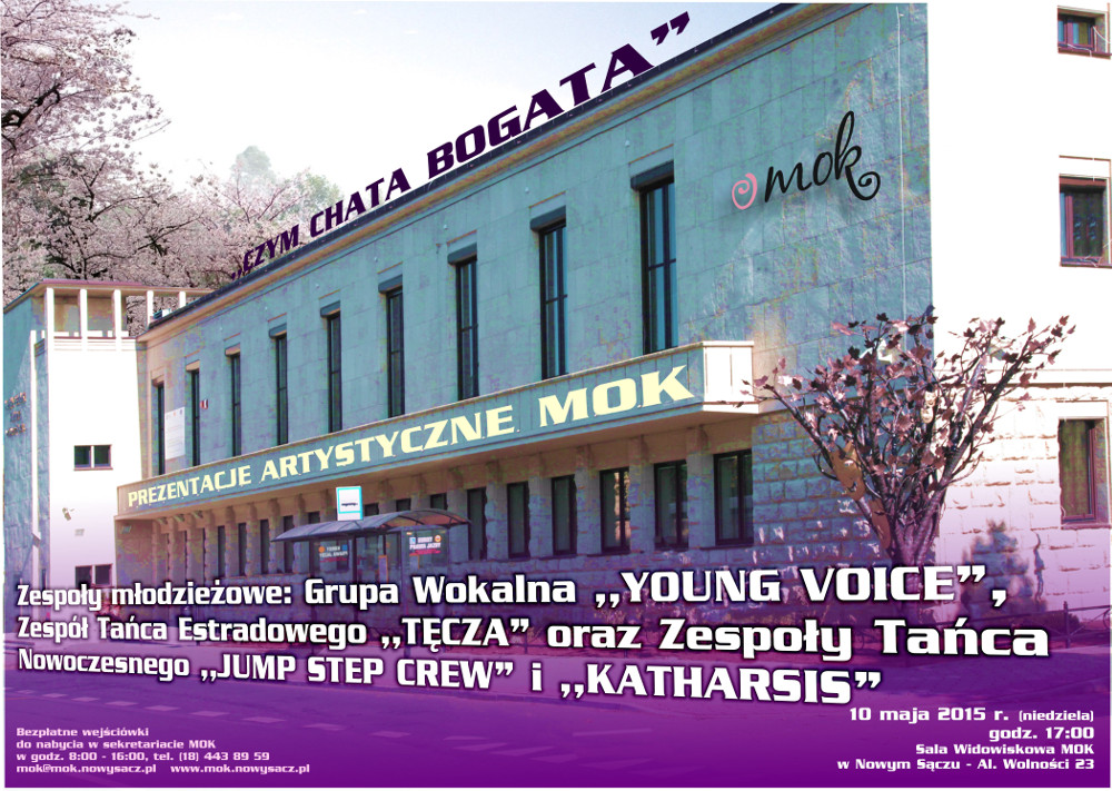 Przed sądecką publicznością zaprezentują się zespoły artystyczne, działające pod patronatem Miejskiego Ośrodka Kultury, a wśród nich: Grupa Wokalna "Young Voice",Zespół Tańca Estradowego "Tęcza" oraz Zespoły Tańca Nowoczesnego -"Katharsis" i "Jump Step Crew".